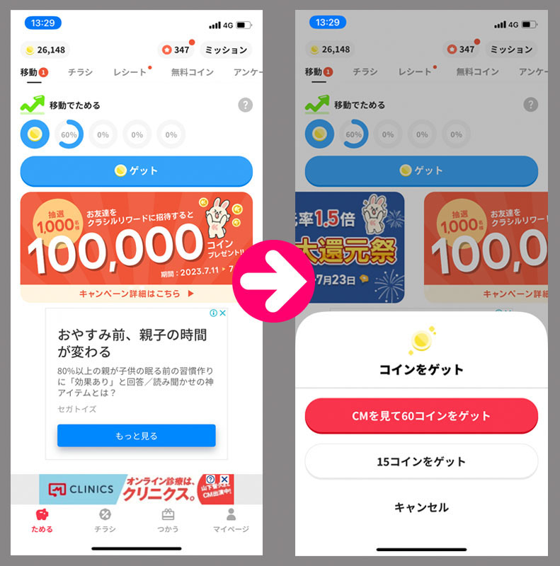 すると「CMを見て60コインをゲット」が表示されます。こちらをタップしないで「15コインをゲット」だとこれで終了です。・・・が以前も書きましたが投資に回すような資金を貯めるには動画を見て4倍ゲットするしかありません。
