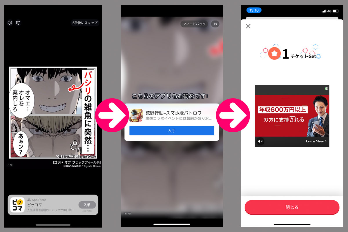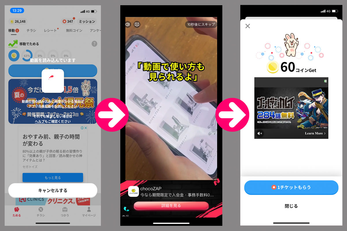 やはり動画を見終わって✖で閉じて「✪1チケットGet」になります。
