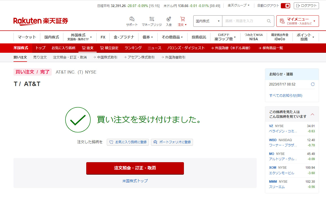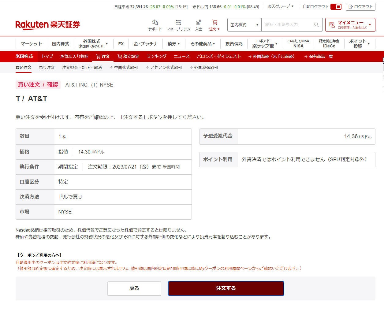 あまりにも下げたのでAT&Tを1株。口座にBACの配当で入った$が少しだけあったので・・・。