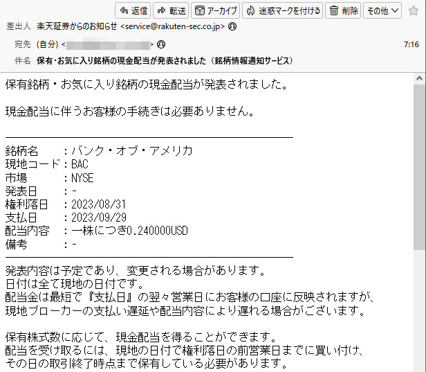バンク・オブ・アメリカ(BAC)配当予告 2023.9 次は9月のバンクオブアメリカ(BAC)の配当のお知らせメールが来ました。 米国の個別は早いですね~バンカメは一昨日決算があったようですので翌日には配当の案内が来るみたいです。 $0.24×30=$7.2×0.9=$6.48×0.79685=$5.163(予定)