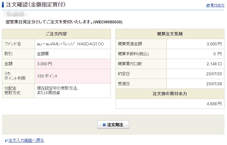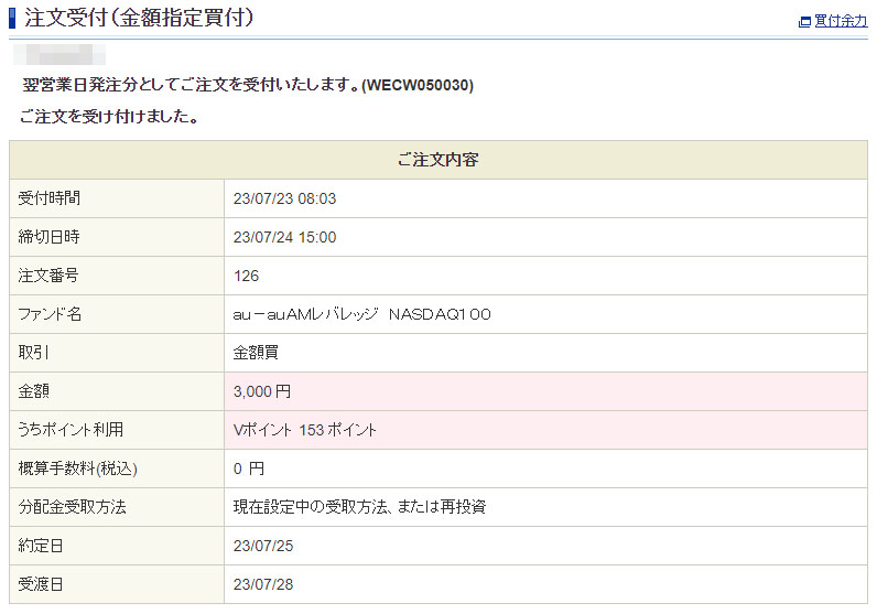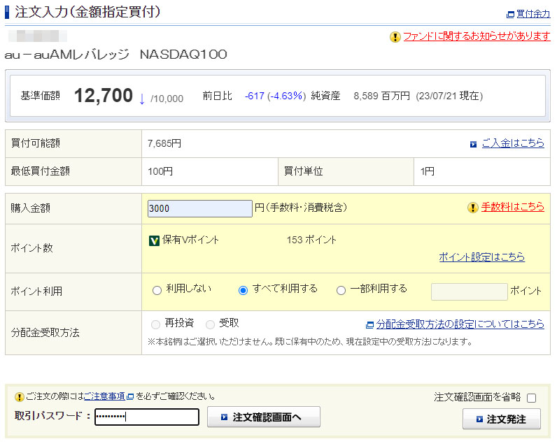 Vポイントが入ったのでauAMレバレッジNASDAQ100を3,000円分追加|2023.7.23 「auAMレバレッジNASDAQ100」へも今回は3,000円分を投入! ポイントは残り「すべて利用する」で153ポイント。 やはり口座からの持ち出しは2,847円 こちらも火曜日の約定です。 週末のNYは「NASDAQ100」が下がっていましたが月曜はどうかな~???