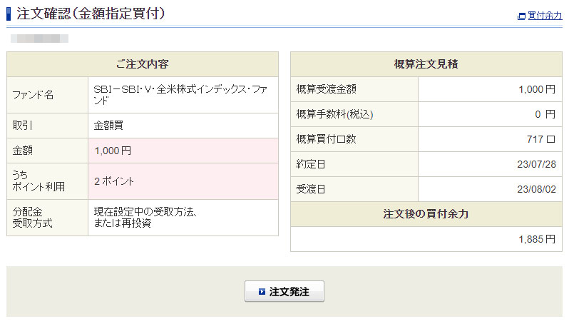 入った分をとりあえず。2ポイント分を使って1,000円分を「SBI・V・全米株式インデックスファンド」へ