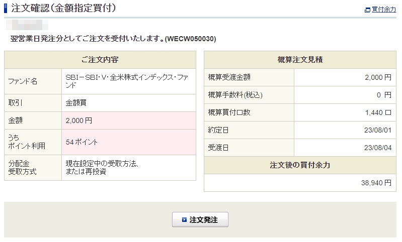 Vポイントが入ったのでSBI・V・全米株式インデックスファンドを2,000円分追加|2023.7.28 昨日、今月最後と書きましたが「Vポイント」が入ったので楽天銀行からSBI証券口座に資金を移動して今度がホントに今月最後www 今回入ったのはSBI証券のクレカ積み立て分の50ポイントと 「三井住友カードVISA(NL)VポイントUPプログラム特典/クレジット」の58ポイント。 VポイントUPプログラム特典???これもエントリーしたのかな?良く覚えておりませんw 今回は2つ分で2,000円分を入れます。ポイントは半分の54ポイント。 口座からの持ち出しは1,946円となります。 コツコツと・・・笑