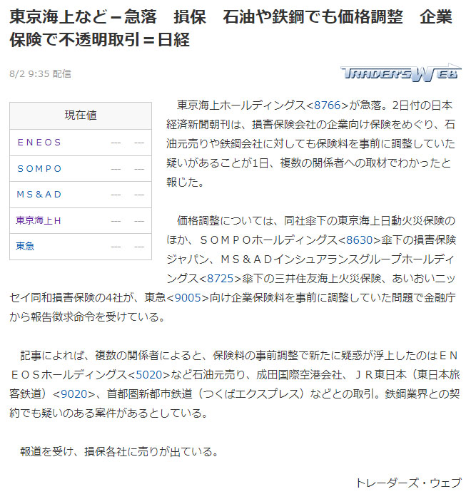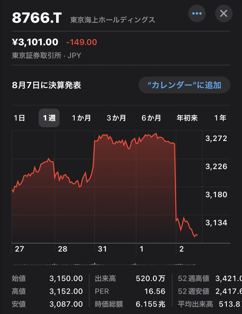 昼休みになり株価をチェックしていると「東京海上ホールディングス」が大きく下げていました。