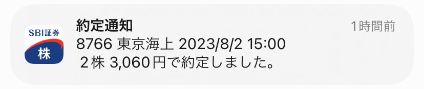 昨夜、今月分の買付を済ませて無事朝の9:00には約定の通知がSBI証券から入ってきていました。