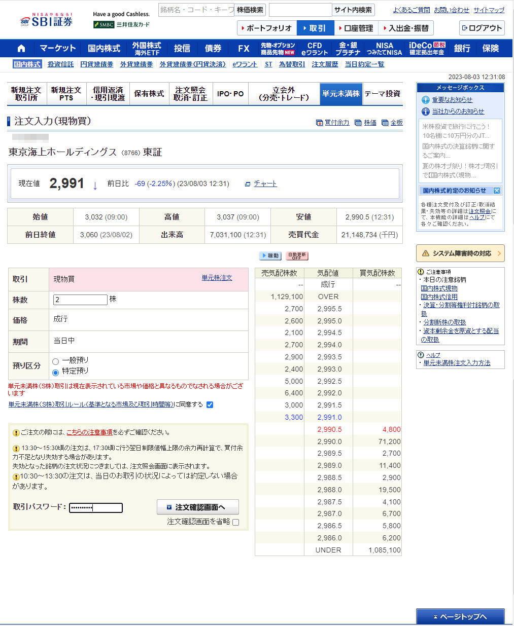 お昼休みの時点では昨日の終値よりさらに下げて2,991円ついに3,000円割りました