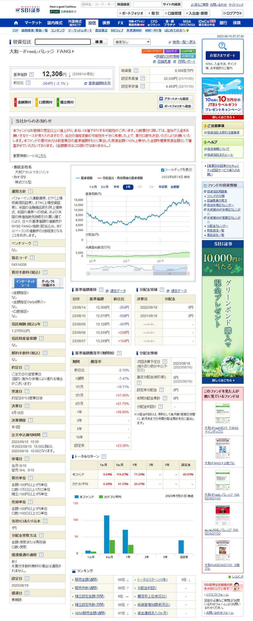 設定日は2020年8月でもう3年も経っていますがレバナスに比べると総資産は思ったほどでもない。買付のランキングも高くないし利回りは良い(今のところ)が人気はあまり・・・って感じです。他にもFANG+にレバレッジを掛けたファンドもありますが償還日があったりします。こちらは無期限。