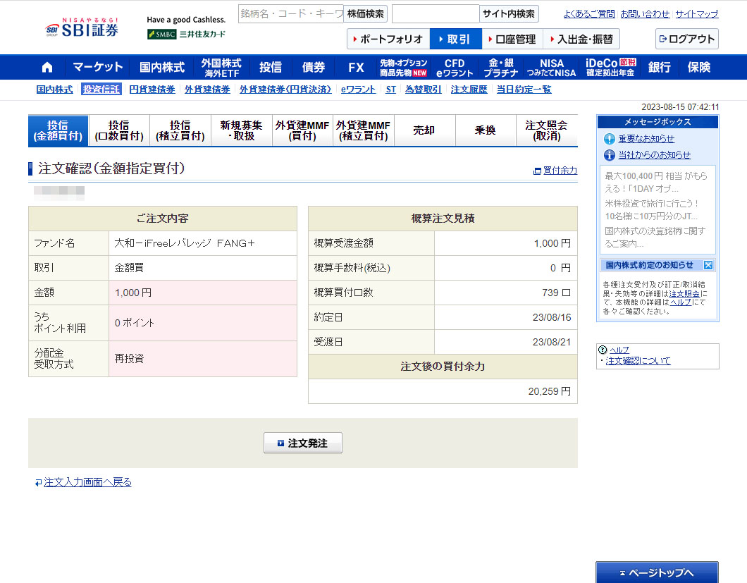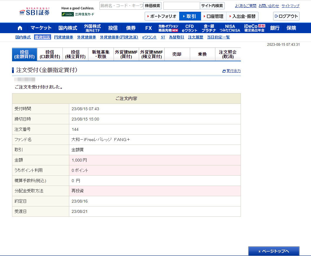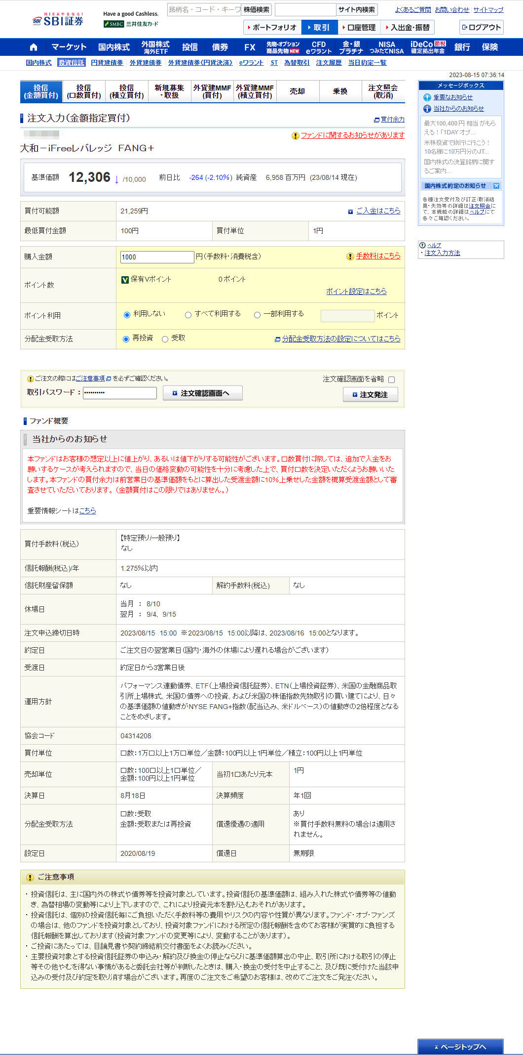 今回は「iFreeレバレッジ FANG+」に1,000円入れました。初めてのファンドです。