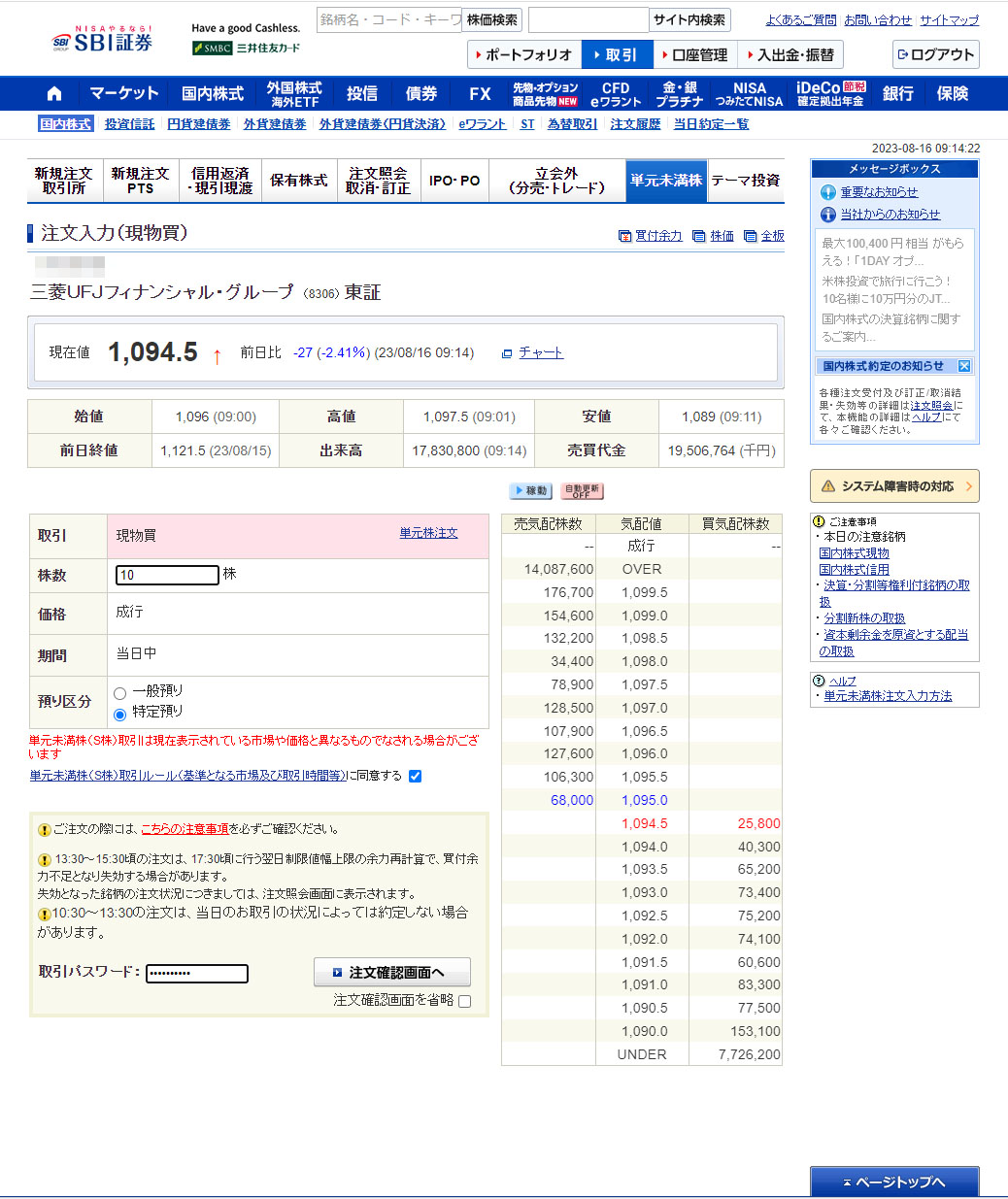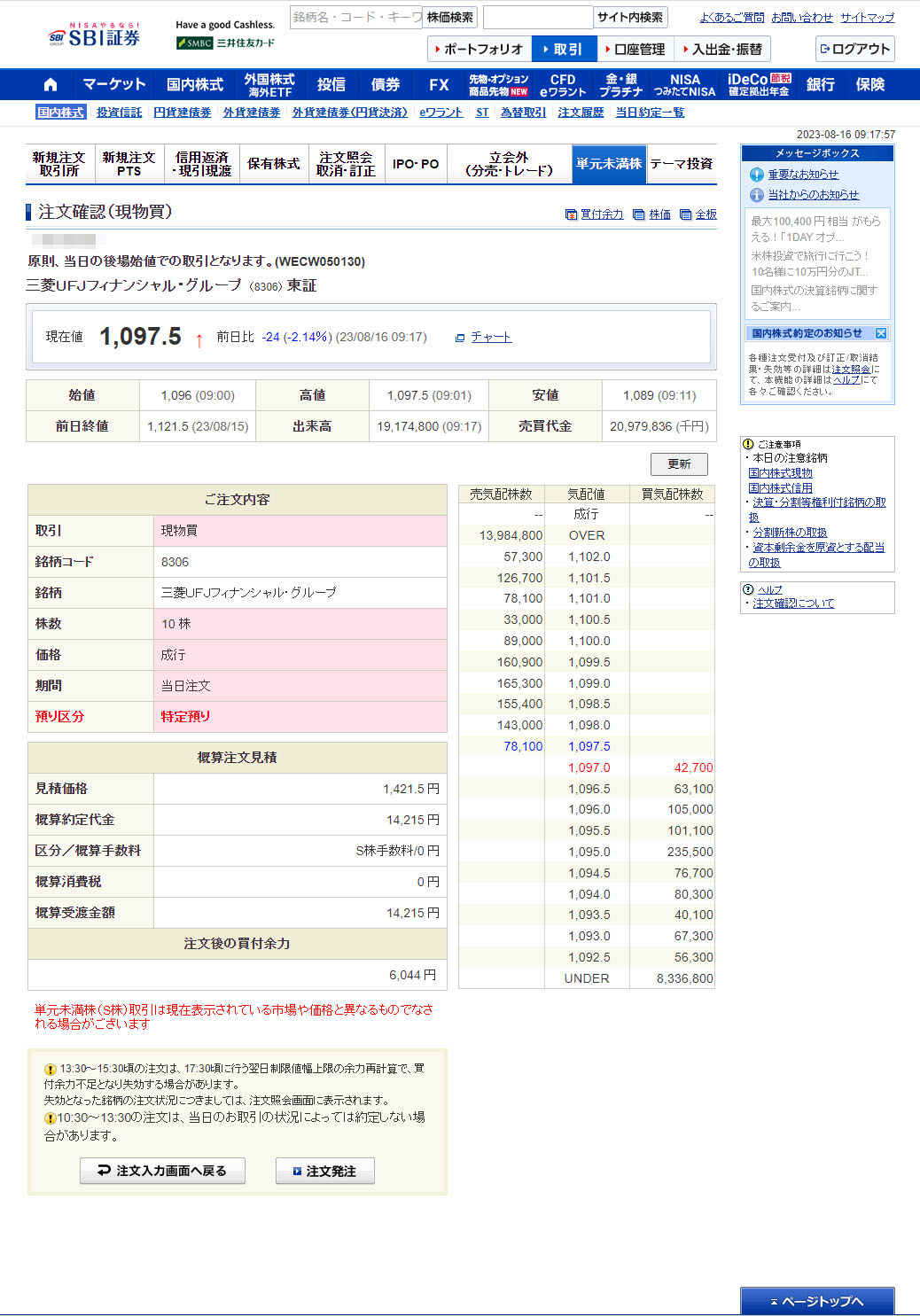 入力中に上がり始めた!やばいやばい。とは言え・・・単元未満で成行での購入なのでの午後の寄付きの価格で約定となり今の株価は参考程度になります。