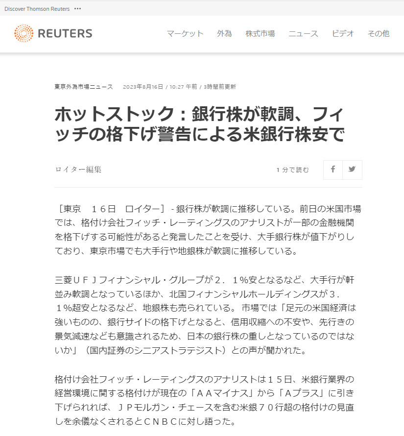 ロイターの記事にもあるように日本の銀行にも悪材料として株価に。。。