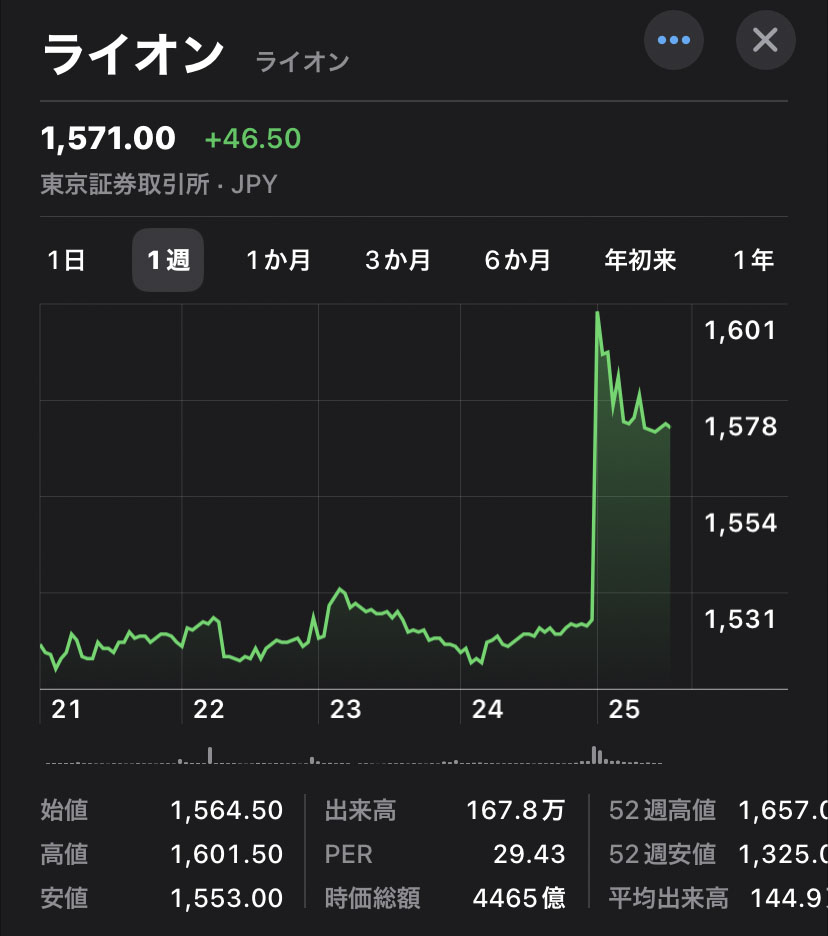 前回、決算で株価が上昇した「ライオン」について書きましたが、その後はヨコヨコでの推移。そして今日一気に上がりました。