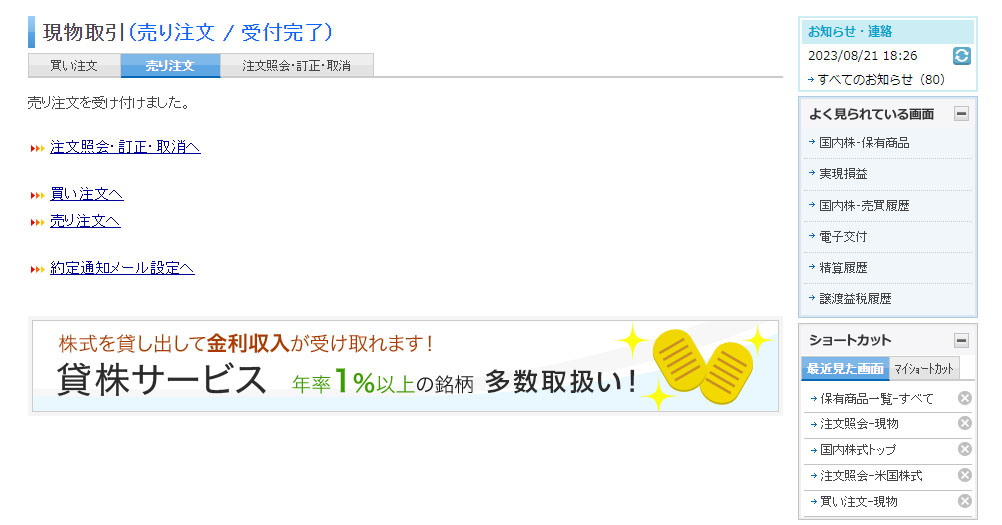 実は8月21日に売り注文を入れていて指値が刺さって本日約定しました。