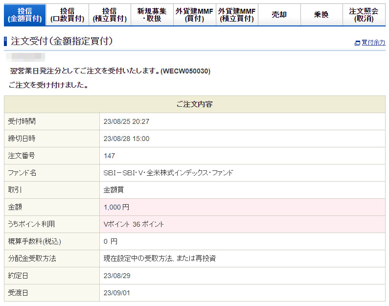 Vポイントが入ったのでSBI・V・全米株式インデックスファンドを1,000円分追加|2023.8.25 月末が近づき「Vポイント」が入る時期になってきました。 今回は「三井住友VISAカード」の9月請求分(8月利用分)で72ポイントです。 またお馴染みの「SBI・V・全米株式インデックスファンド」へ半分の36ポイントを使って1,000円分入れます。 今回から「注文確認画面を省略」にしました。 口座からの持ち出しは964円 約定は29日です。 日本時間で今夜「ジャクソンホール」でのパウエルさんの会見がありますが・・・さてどうなるでしょう???