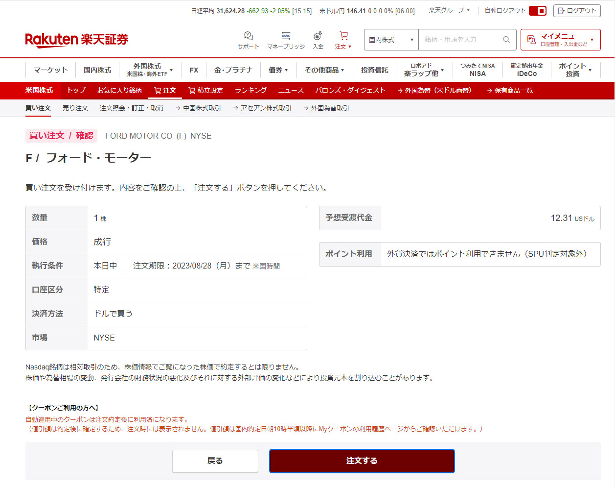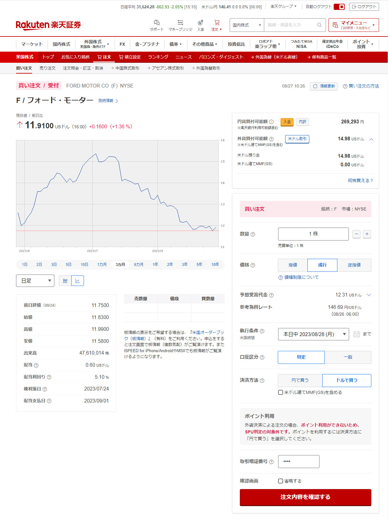 口座には$14程あったので今回は成行で注文します。