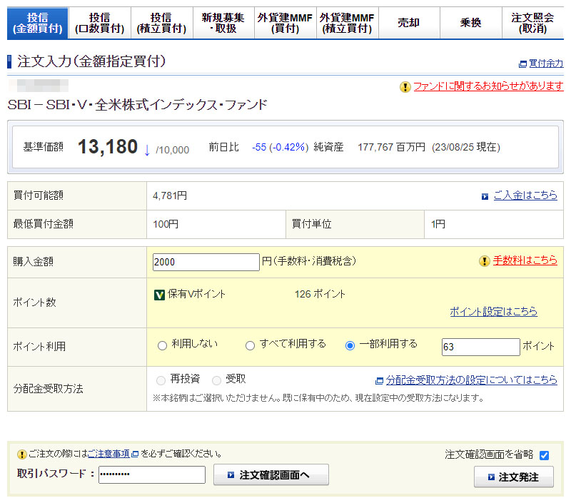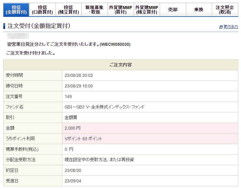 Vポイントが入ったのでSBI・V・全米株式インデックスファンドを2,000円分追加|2023.8.28 週末にまとめてポイントが入ったため3つ分の入金・・・の予定でしたが「買付余力」が足りず2,000円の入金になりました。。。 今回からは「投信マイレージ」と明記され分かりやすい・・・が私の計算だと5ポイントのハズなのですが???計算式に間違えがあるのかも・・・暇なときに再調査します。 その他も何時もと同じポイントで今月はキャンペーンは外れたようです。。。 ホントは3,000円入れるところですが2,000円で・・・Vポイントは半分の63ポイント 口座からは1,937円になります 明日の扱いになりますので約定は30日です。