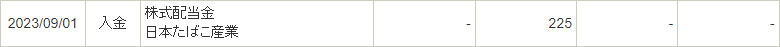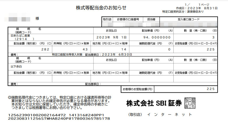 日本たばこ産業(2914)の配当が入りました|2023.9.1 単元未満で保有している株式で初めて配当が出ました! 日本たばこ産業・・・JTです。 現在は8株保有中ですが、落ち日時点では3株だったようですwww さすがに日本が誇る高配当銘柄www 94円配当が出ましたので 税引き後225円の配当金を受け取ります。 単元未満でもしっかり配当が出ますね~ 当然ちゃ~当然なんでしょうけどw