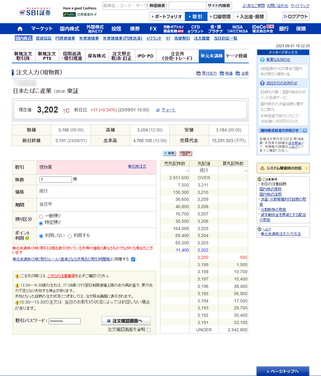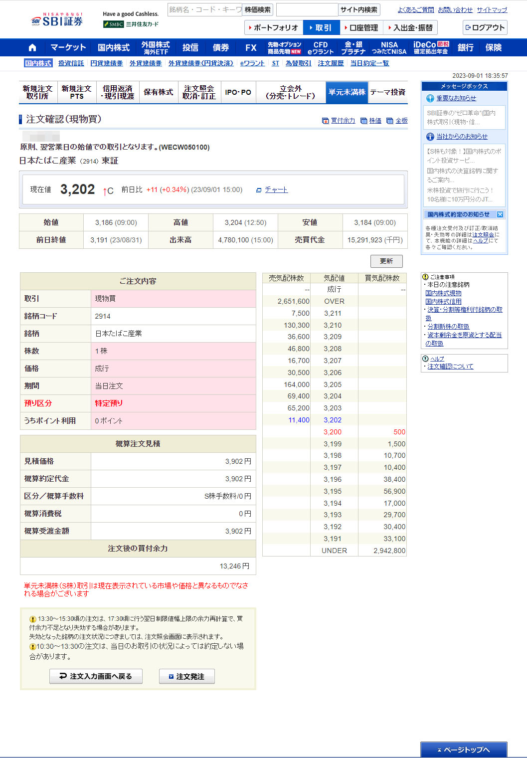 今日の終値は3,202円。PTSでは3,200と少し下げています。