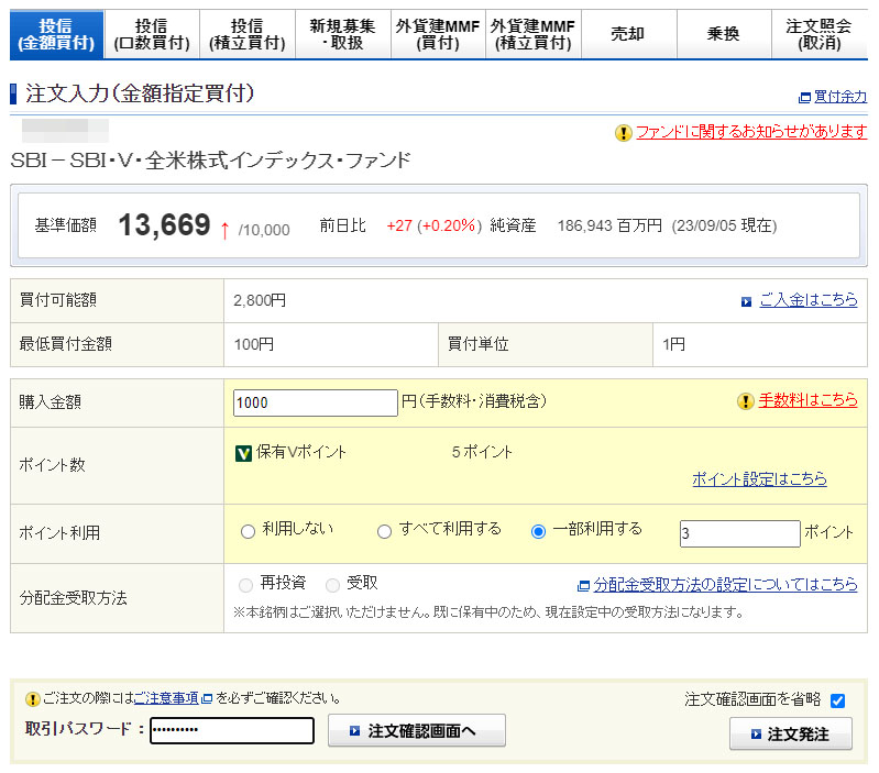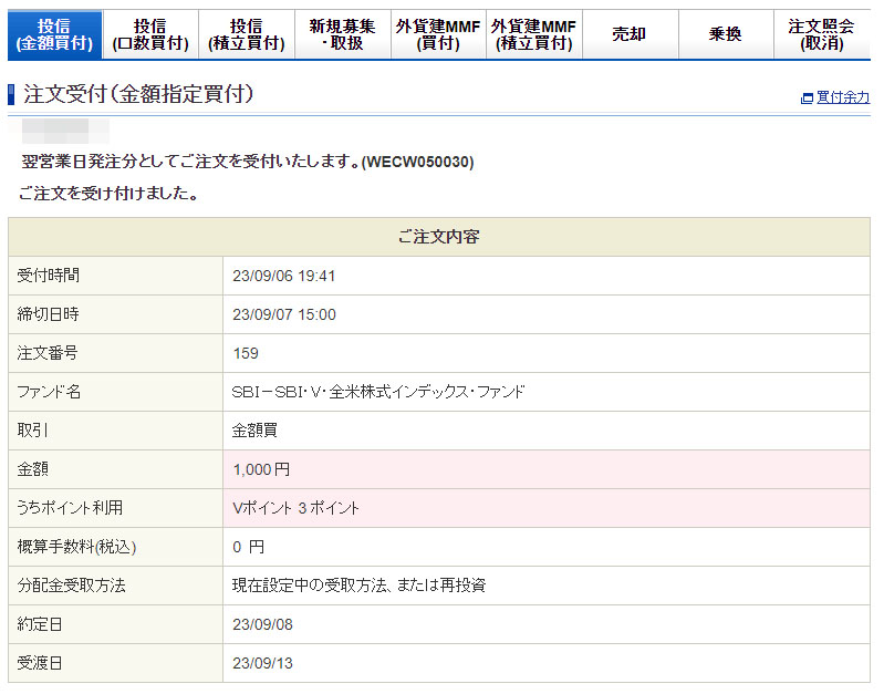 月が変わってVポイントが入ったので何時もの様に「SBI・V・全米株式インデックスファンド」へ1,000円分入金します。