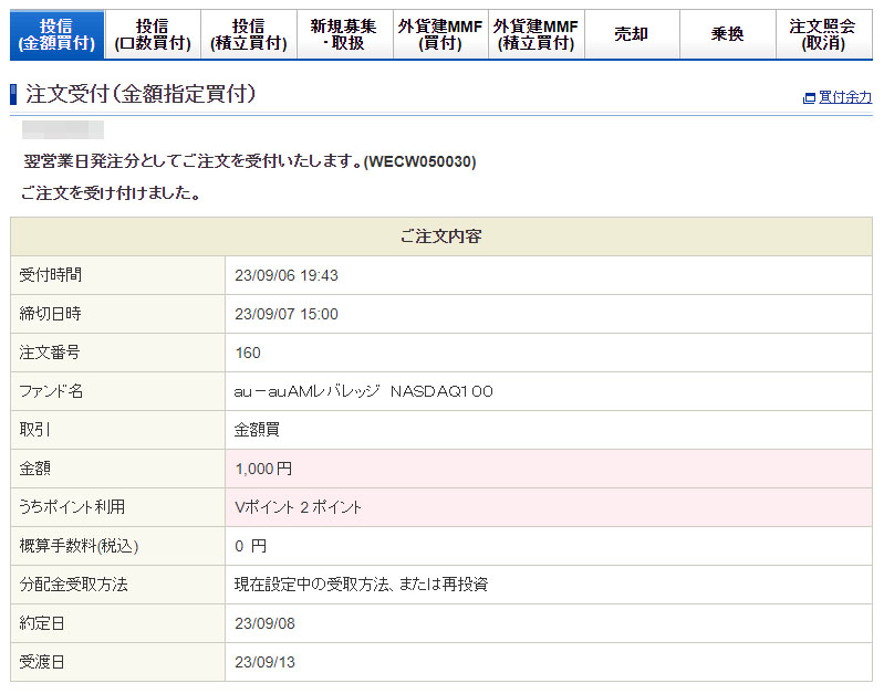 Vポイントが入ったのでauAMレバレッジNASDAQ100を1,000円分追加|2023.9.6 同様に「auAMレバレッジNASDAQ100」へも1,000円分。 「すべて利用する」で2ポイントです。 口座からの持ち出しは998円 約定は9月8日です。 「auAMレバレッジNASDAQ100」は新NISAでも買えないので多分、来年もこのままかと・・・。
