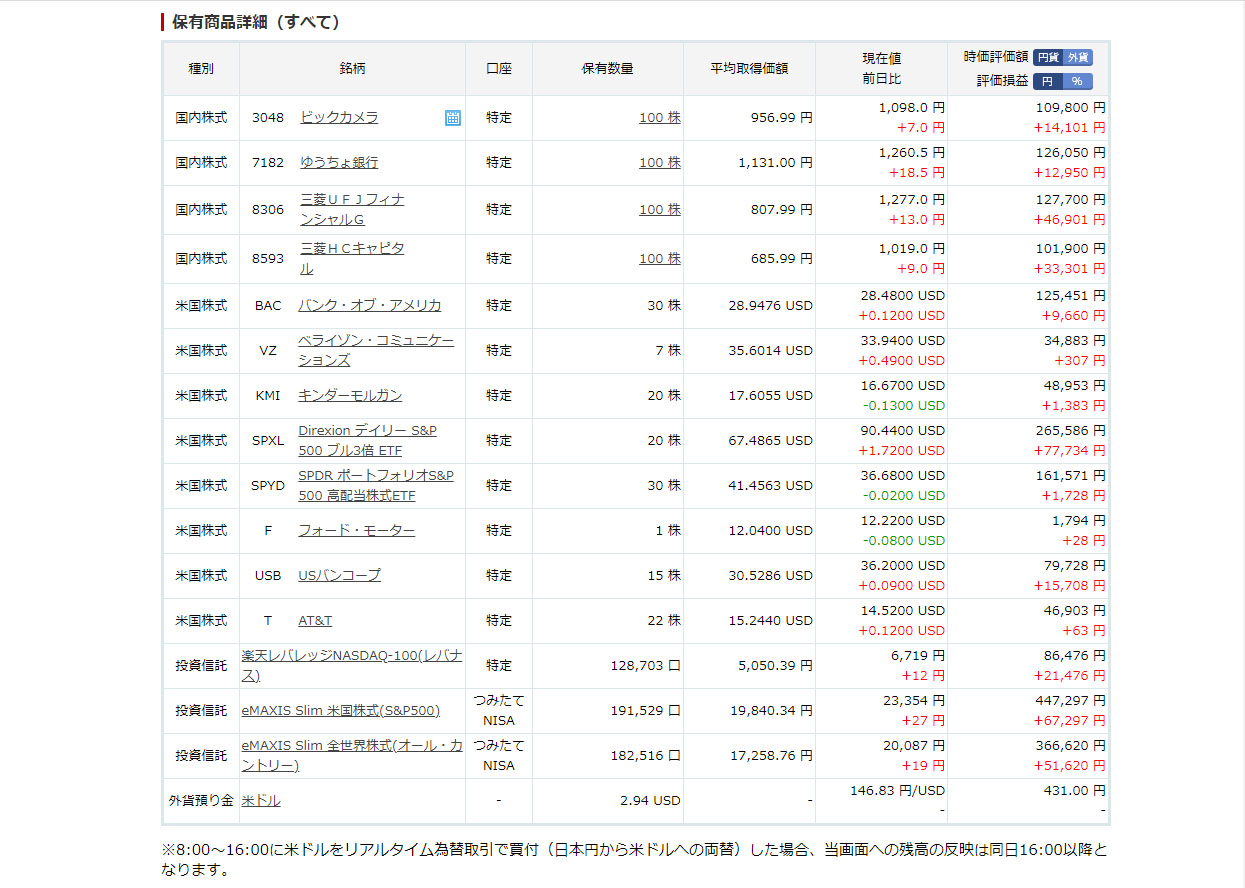 昨日、VZとTが評価損になっていましたが今日は全ての銘柄が含み益です。円安ですしね。