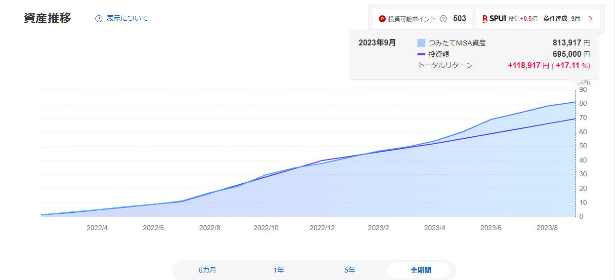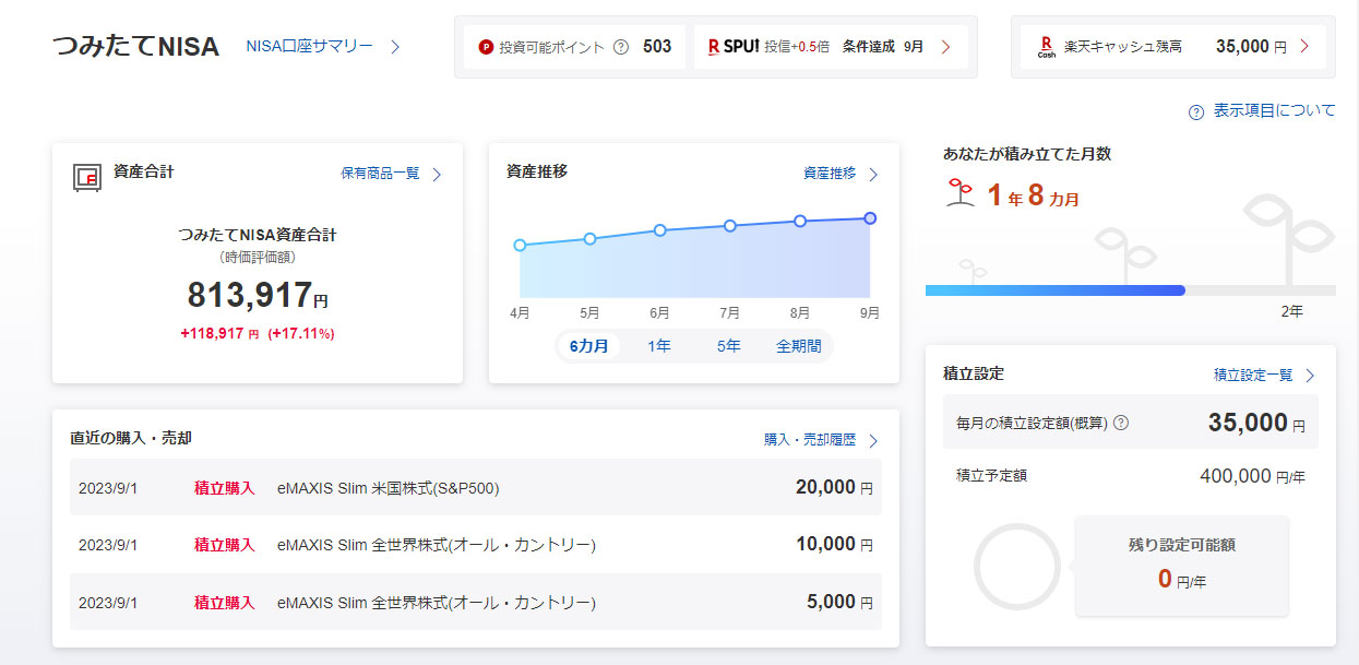積立NISAも+17.11%にもなっています。ここ1ヵ月は少し勢いがなくなりました。中国経済低迷の余波だと思います。こちらの口座は今年いっぱい。新NISAをSBI証券に移したとしても楽天証券のままだとしてもあと3ヵ月程です。