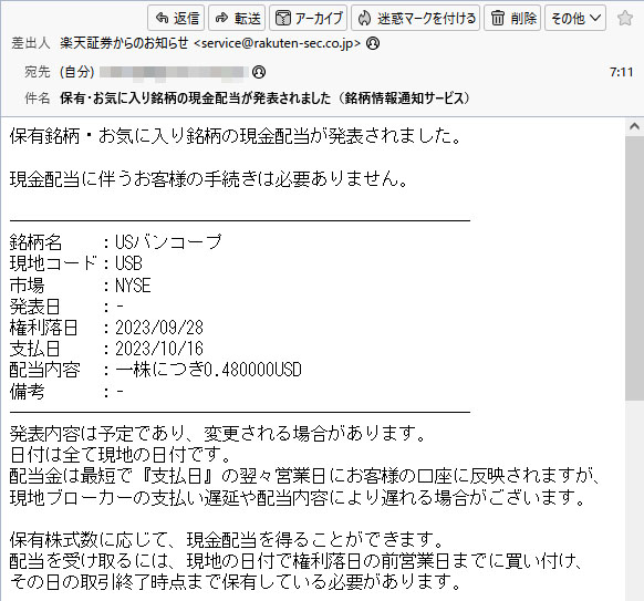 USバンコープ(USB)配当予告 2023.10 10月配当の「USバンコープ」の案内メールが来ました。 15株保有していますので 15×0.48=$7.2 7.2×0.9=$6.48 6.48×0.79685≒$5.16(758円)となります。※ドル円は147円換算 今の株価だと利回りは5.48%です
