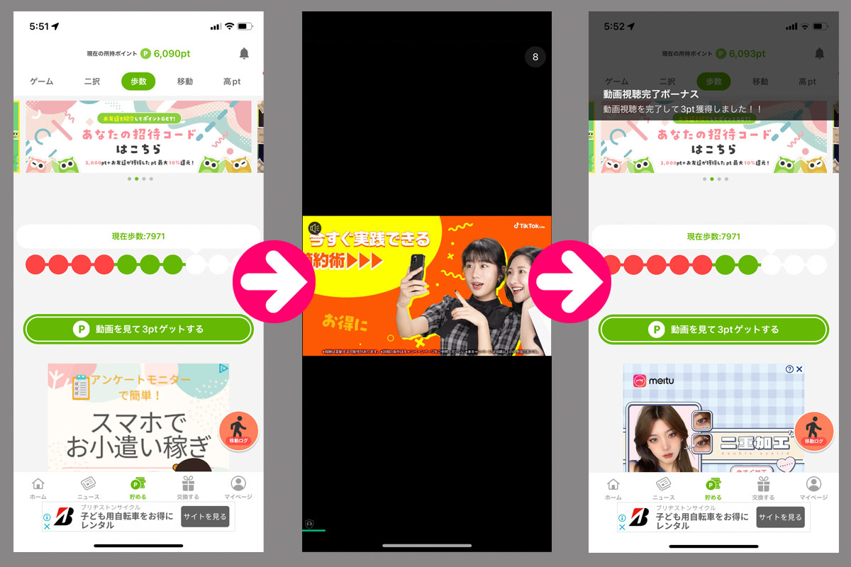 そのままw ですが歩くと10個まで●が貯まってそれぞれ動画を再生すると3ptが入ります。