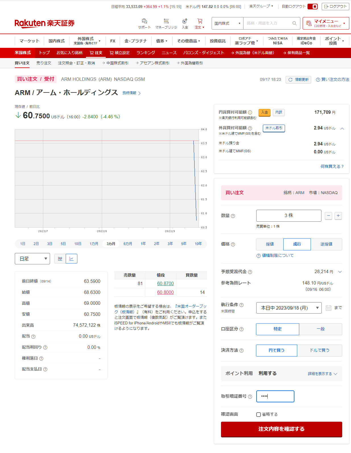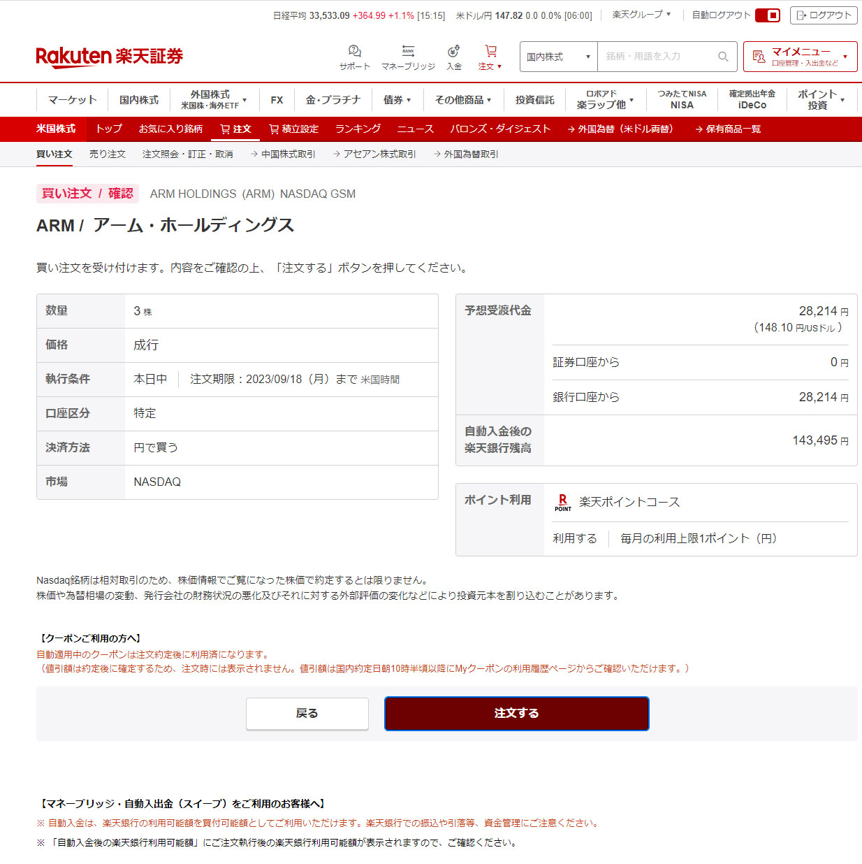 今回は成行での注文。少しでも下がってくれたら・・・。