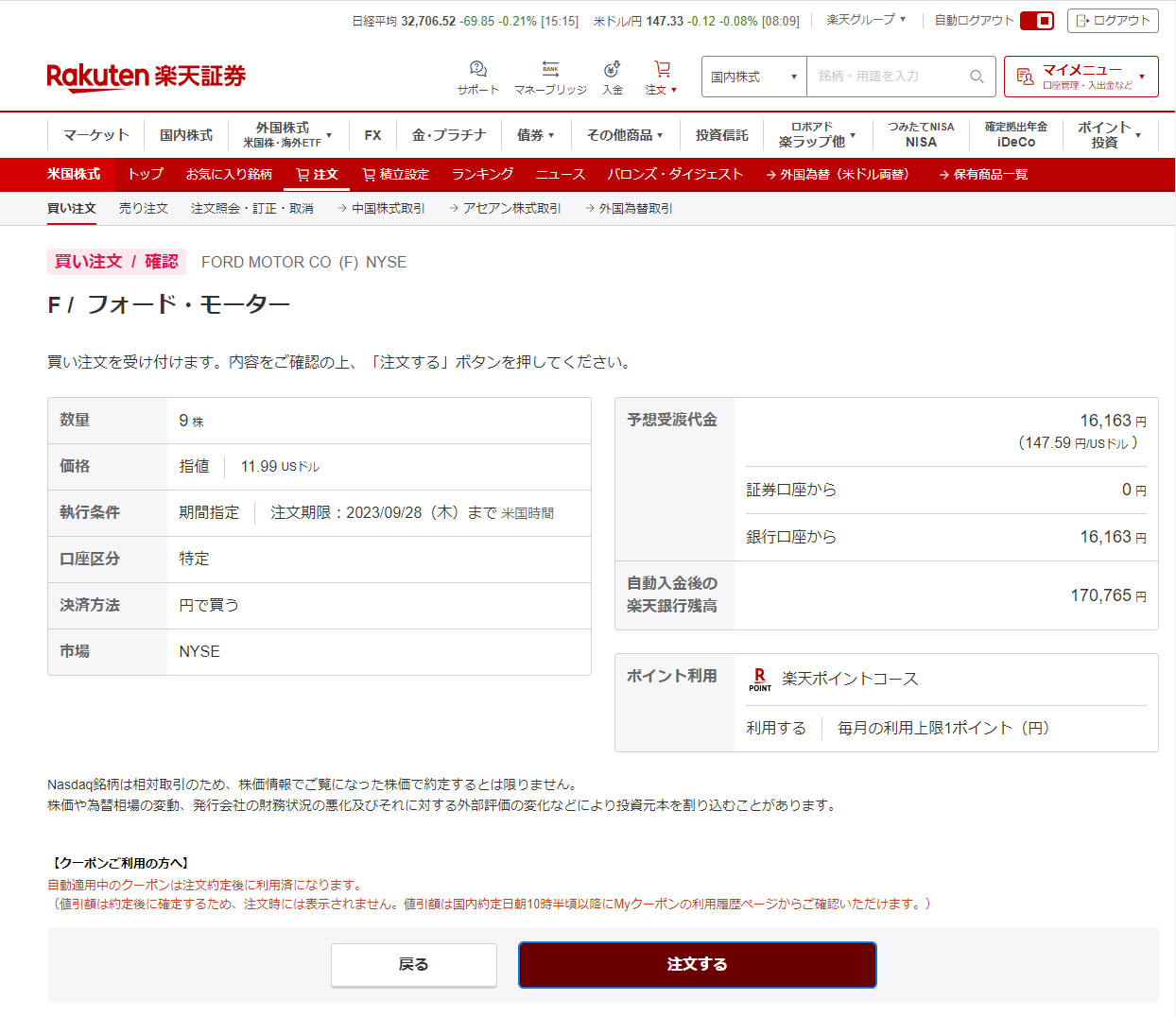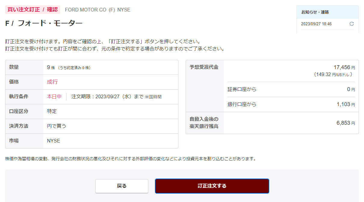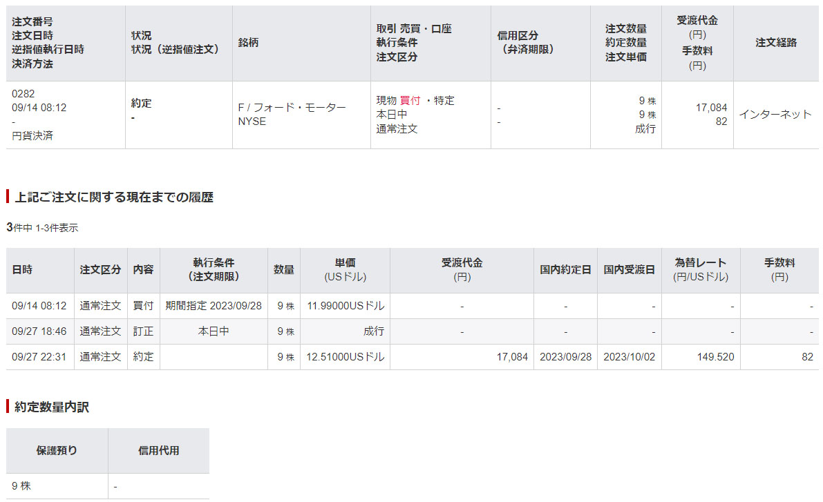 切り良く10株にするために9株の注文。口座に$は無いので円貨決済です。