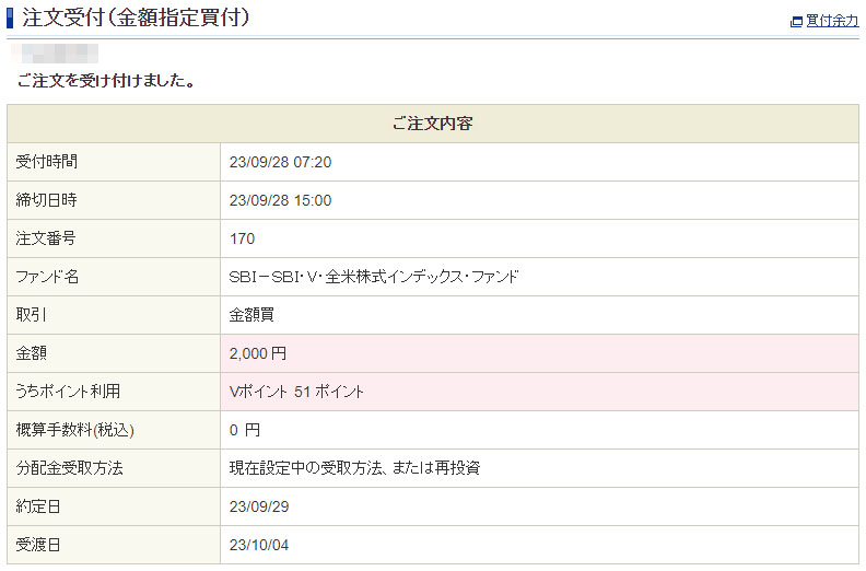 Vポイントが入ったのでSBI・V・全米株式インデックスファンドを2,000円分追加|2023.9.28