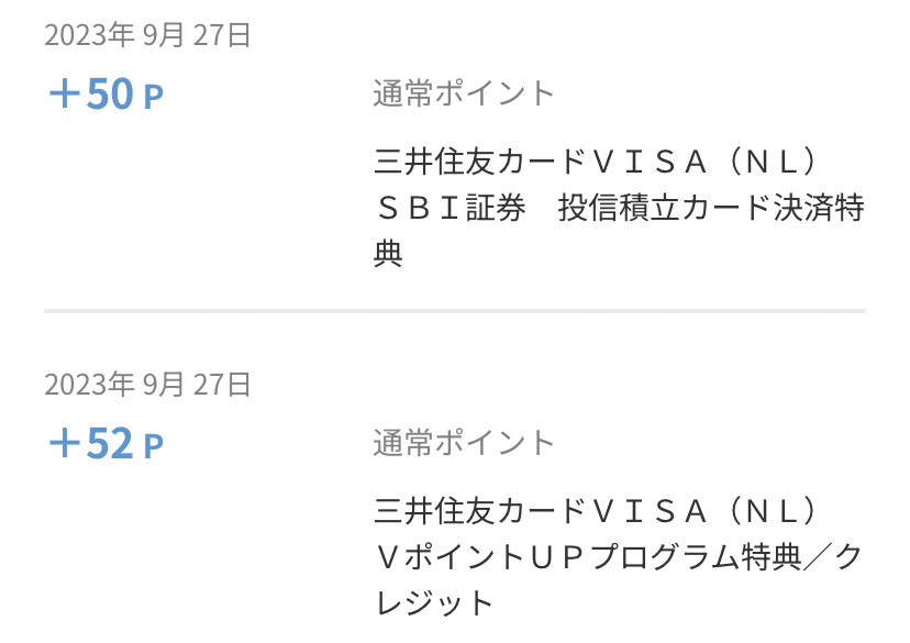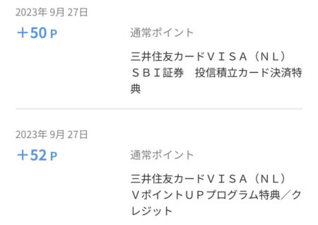 「投信積立」と「VポイントUPプログラム特典」です。相変わらず後者の方は良く分かっていませんが合計で102ポイントです。