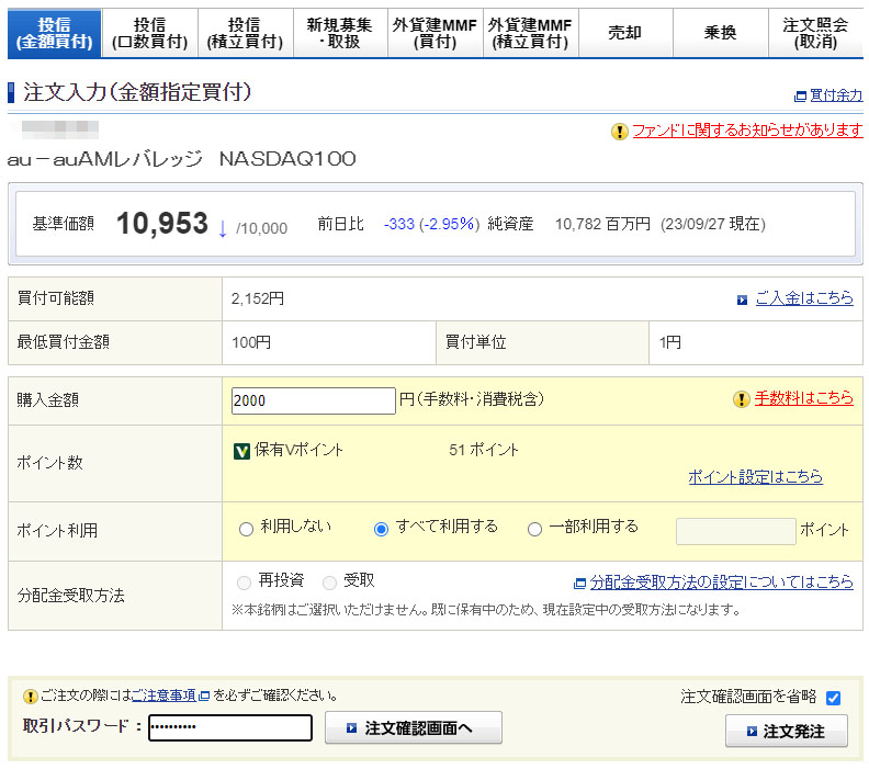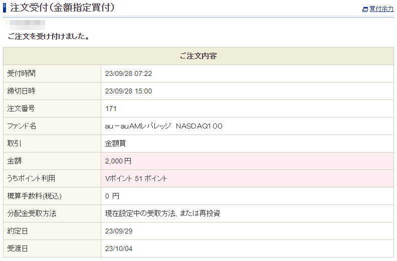 Vポイントが入ったのでauAMレバレッジNASDAQ100を2,000円分追加|2023.9.28 毎度々ですが「auAMレバレッジNASDAQ100」へも今回は2,000円分を投入! 口座からの持ち出しは同じく1,949円です。 約定は明日の29日。今日はNASDAQ100は+0.24%でした。パッとしない相場ですが買い時だと思って・・・。