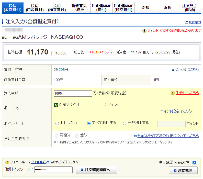 Vポイントが入ったのでauAMレバレッジNASDAQ100を1,000円分追加|2023.9.30 続いて「auAMレバレッジNASDAQ100」にも1,000円分 こちらは2ポイントで口座からの持ち出しは998円となります。 約定は火曜日の10月3日。 NASDAQ100も上がったり下がったりですが下がり相場です。 大統領選挙も近づきイロイロ話題も出てきましたが米国市況は軟調。金利高止まりでNASDAQには逆風。。。安いうちに買えるのはイイけど約定のタイミングで上がってたりします⤵