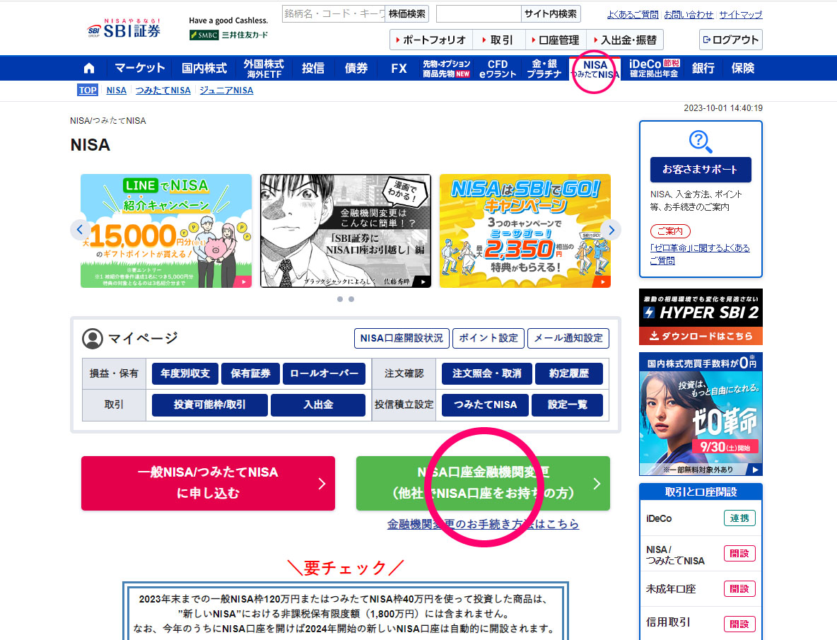 ヘッダーの「NISA つみたてNISA」から『NISA口座金融機関変更(他社でNISA口座をお持ちの方)」をクリック