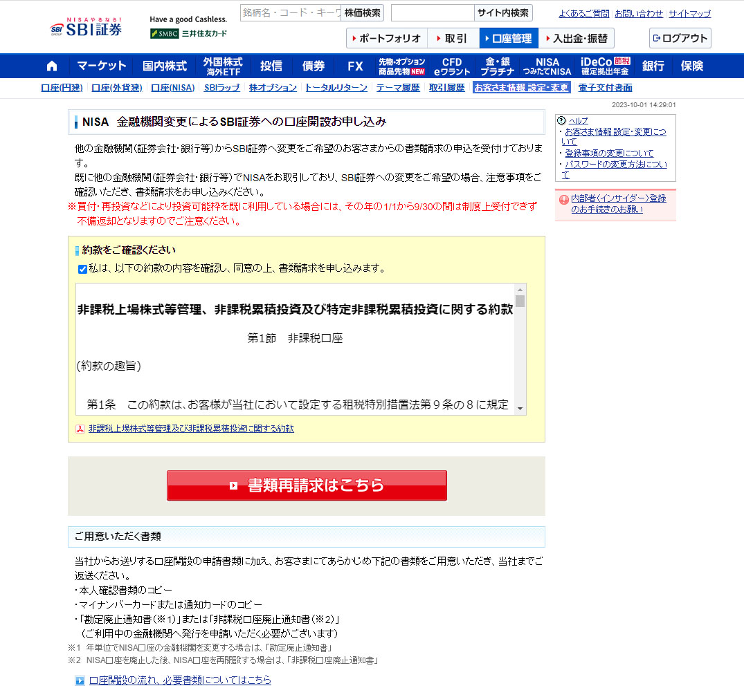 クリック。すると請求がされます。この下に「NISAのご注意事項」がありましたが移管には直接関係ないようです。
