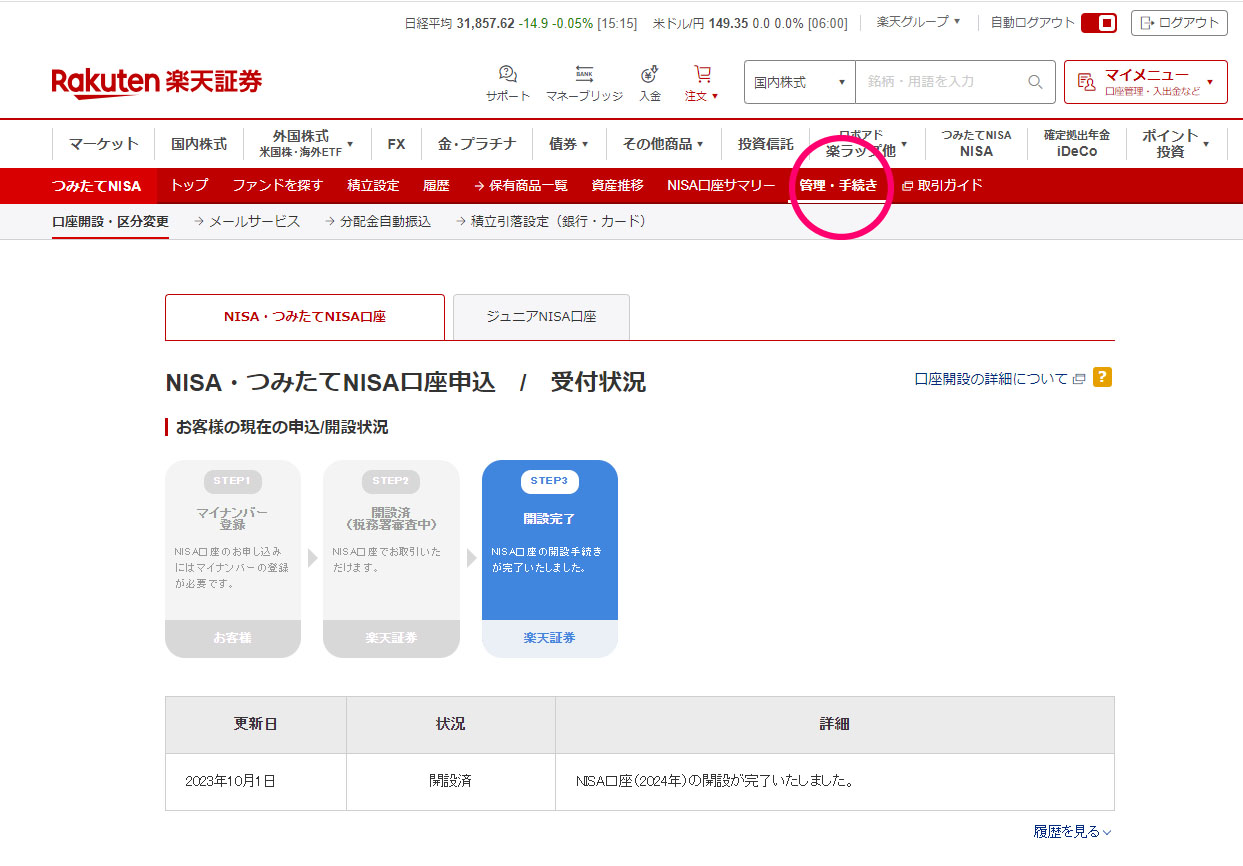 「口座開設・区分変更」のタブをクリックすると『NISA・つみたてNISA口座申込 / 受付状況』が