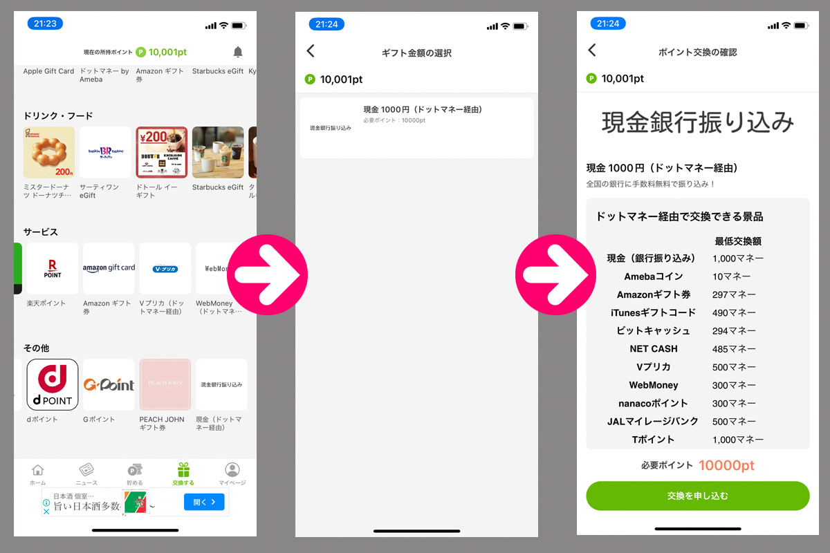 フッターにある「交換する」をタップして「現金(ドットマネー経由)」をタップ。