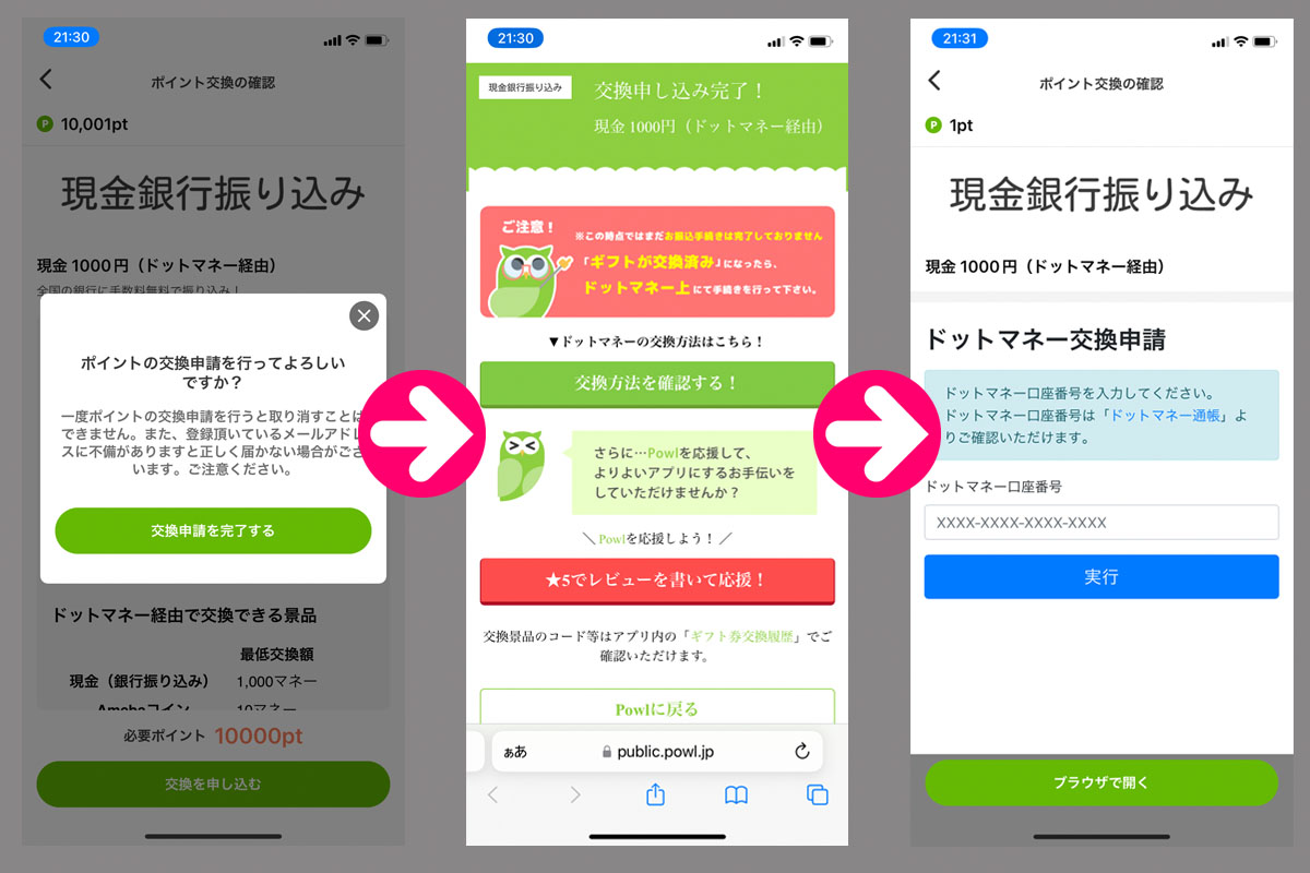そしてPOWLに戻って先ほどの「ドットマネー交換請求」のドットマネー口座番号に今回登録したドットマネー口座の情報を入れ・・・。