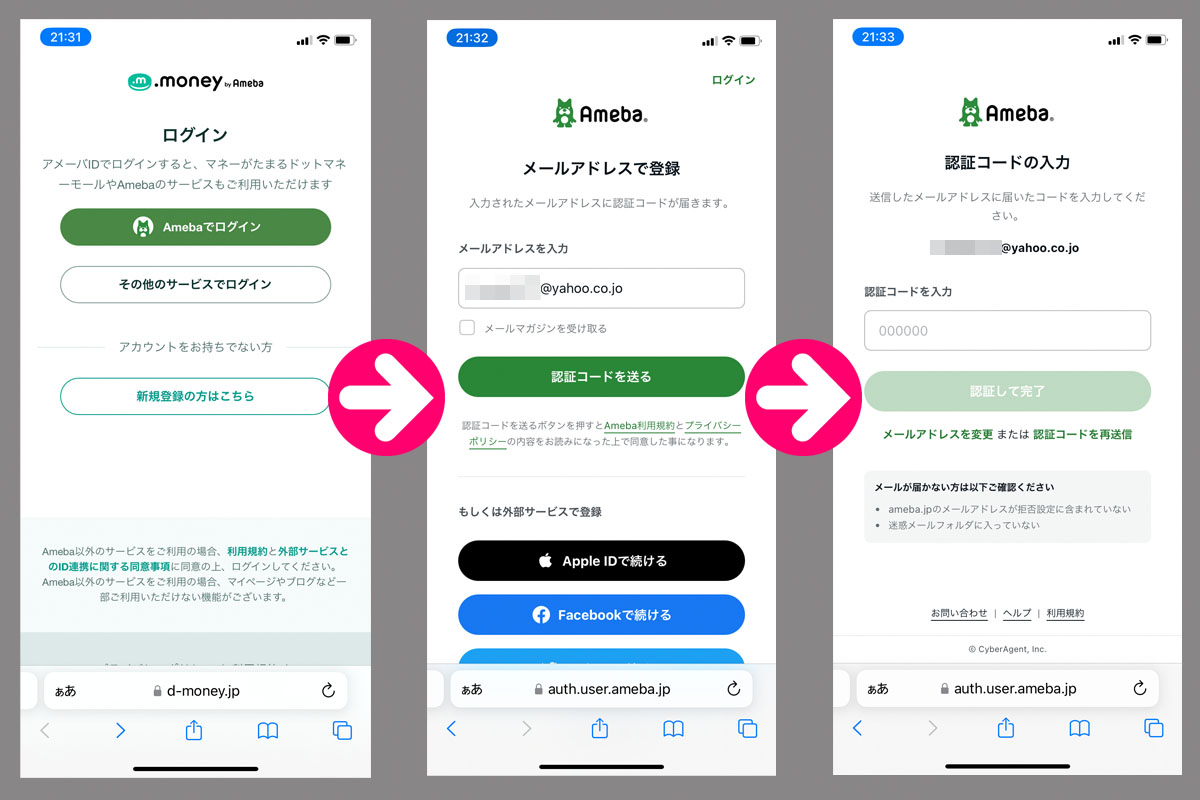 Amebaにアカウントは無いので「新規登録の方はこちら」→「メールアドレスを入力」