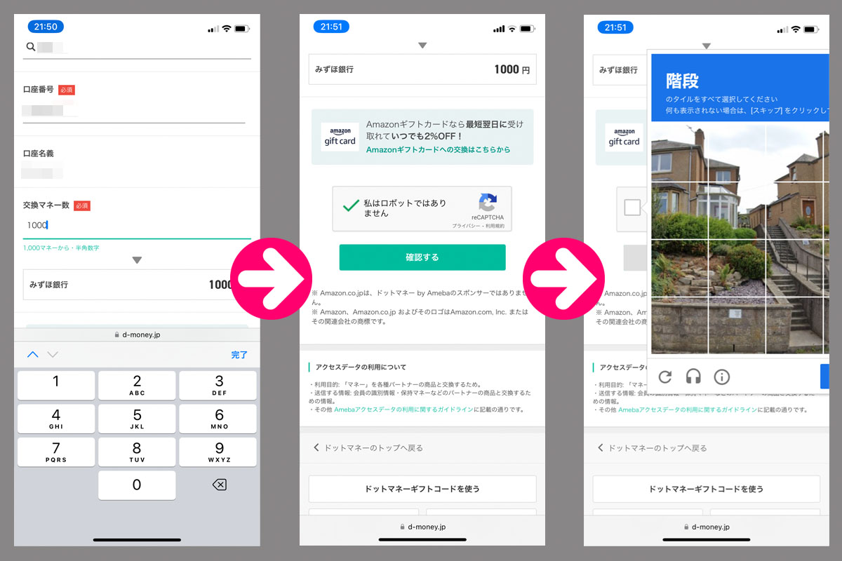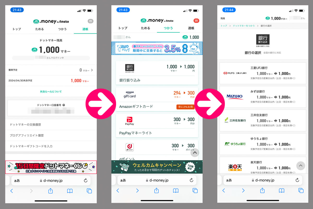 今回は「みずほ銀行」にしました。レートは1,000マネーが1,000円で当然ですが同じです。