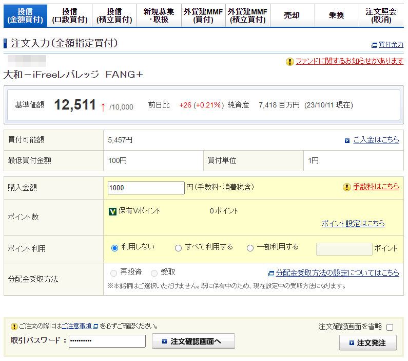 確認画面は省略しようと思っていましたが「概算買付口数」が見たいので「iFreeレバレッジFANG+」に関してはスキップしない事にしました。
