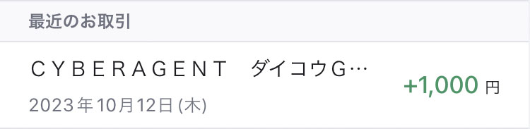 今朝、みずほ銀行の口座を確認するとCYBERAGENTから1,000円の入金が確認できました。