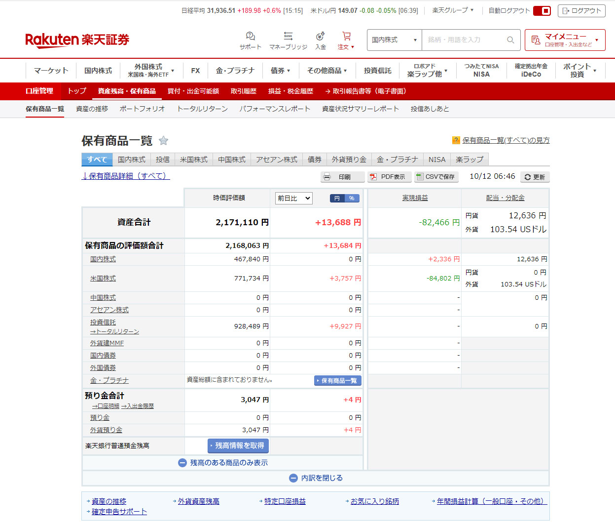 このアセットアロケーションはもういらないかな~楽天証券だけだし。$の為替の記録がしたいので・・・。そのドル円は149.10円。円高だと国内株が軟調になるし円安だと米国株が買い難いし・・・難しいところです。個人的には120円ぐらいがイイと思っていますが。