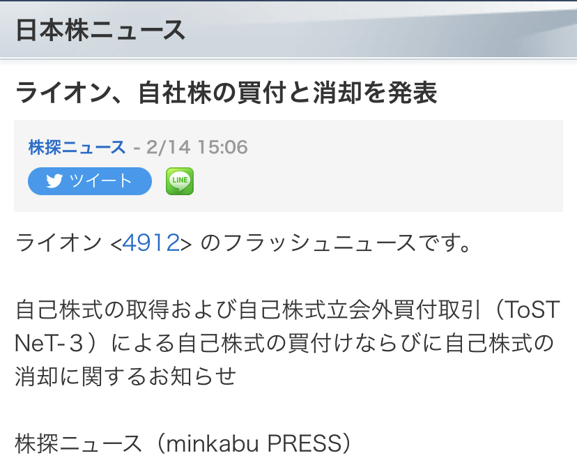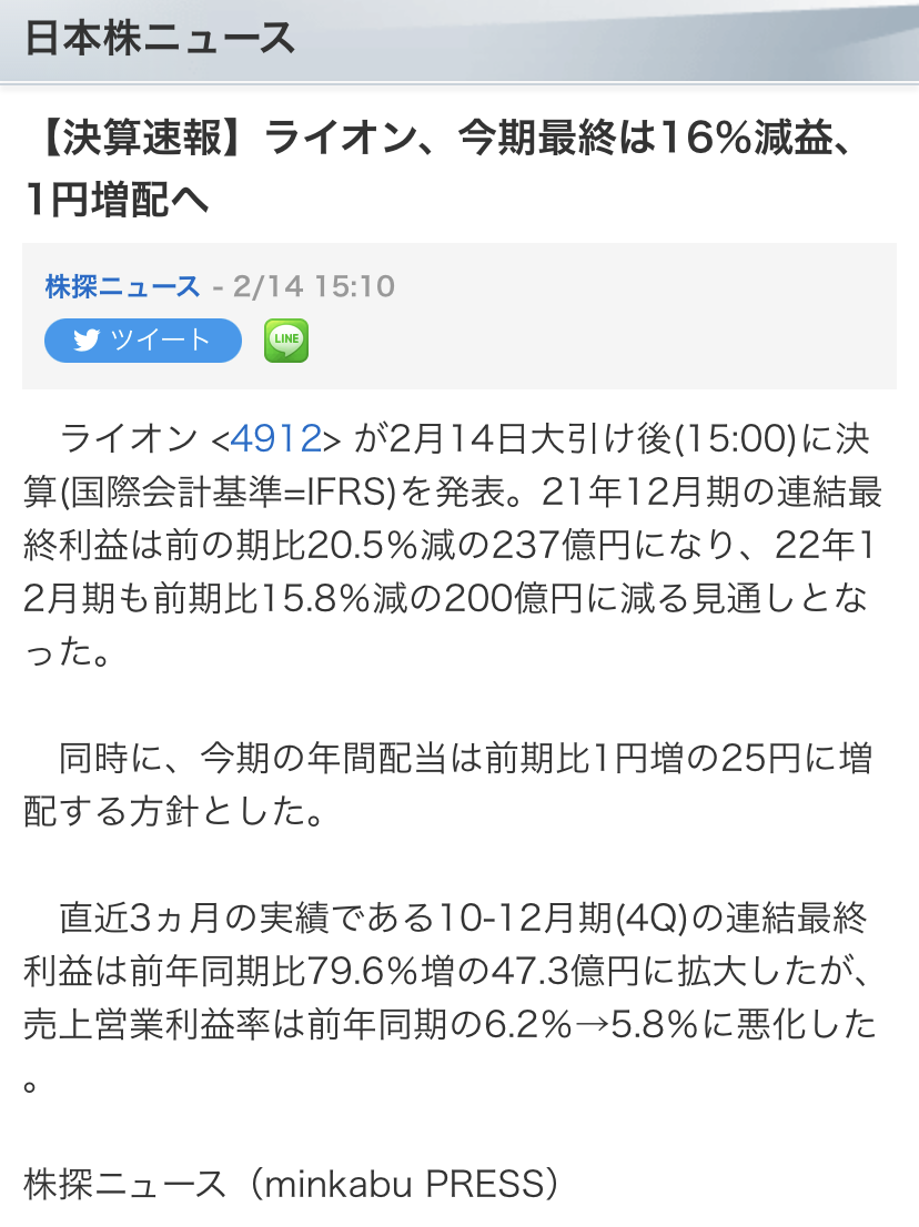 少し前になりますが2月14日にライオンが決算発表をしました。