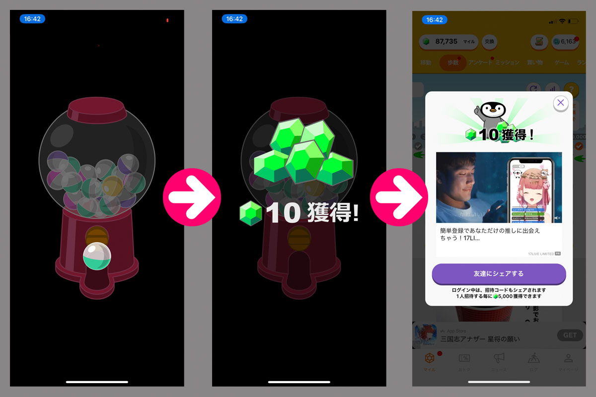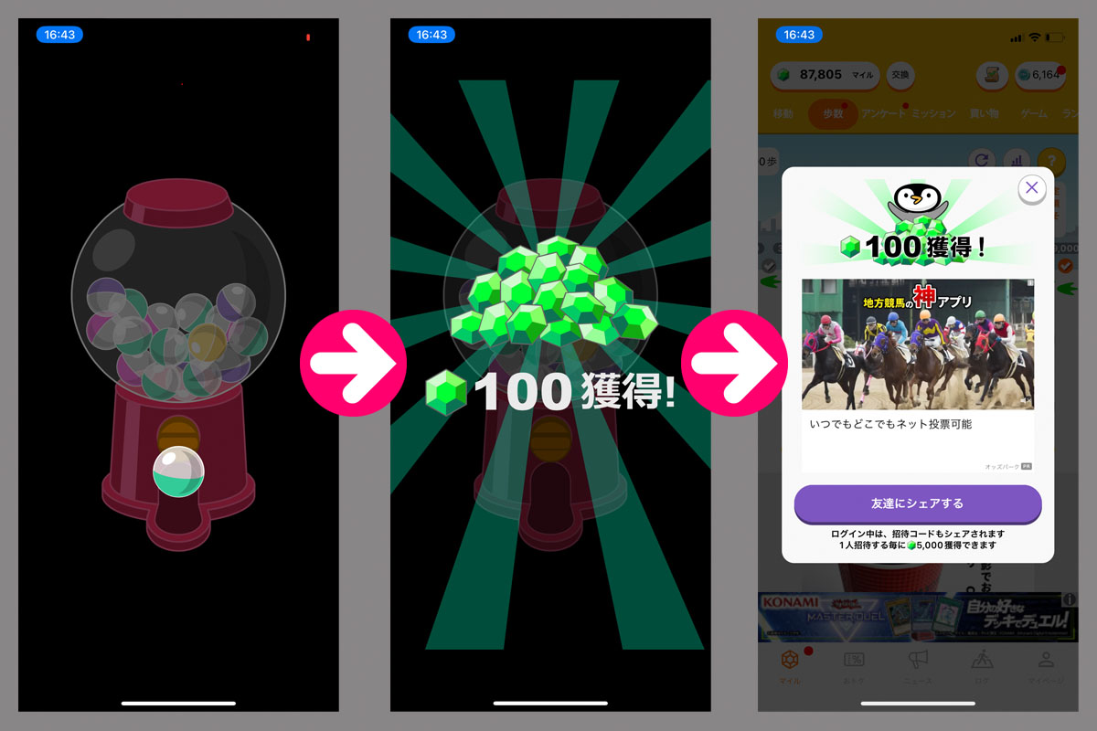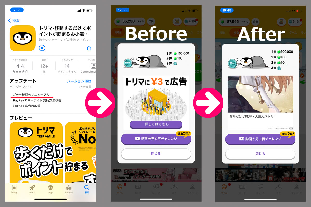 トリマがアップデートしました 昨日、トリマをやっていたらポップアップで「アップデート」のお知らせがありました。 すっかり忘れてて今日になって「アップデート」。 「ガチャ機能のリニューアル」がメイン!今までは1等~3等で1、2等が出たらマイルが付与されましたが今回のアップデートで新たに4等までとなり3等までマイルが付与されるようになりました。 これが3等の10マイル獲得!です。確かに頻度は高いような気がします。 2等の100マイルの出現も以前と変わらない感じ。私ははじめてから10ヵ月経ちますが1等が出たことはまだありません。