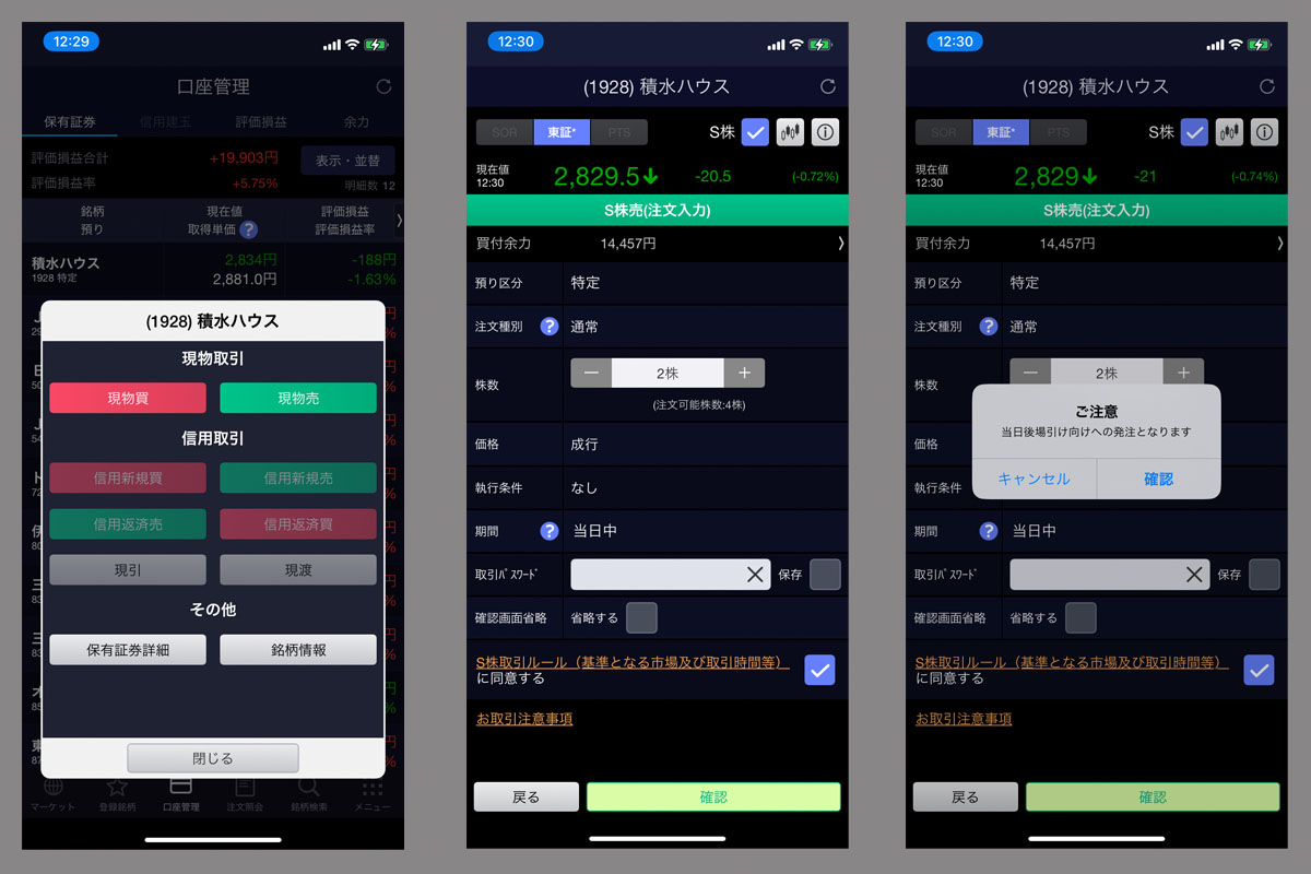 積水ハウスは注文後、少しリバって10円上がって2,839円で約定!