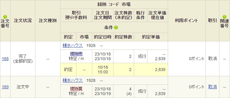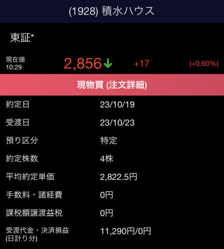 この売買の前の平均は2,881円でしたので39円下がりました。これで「積水ハウス」は結果的にプラテンになりました。