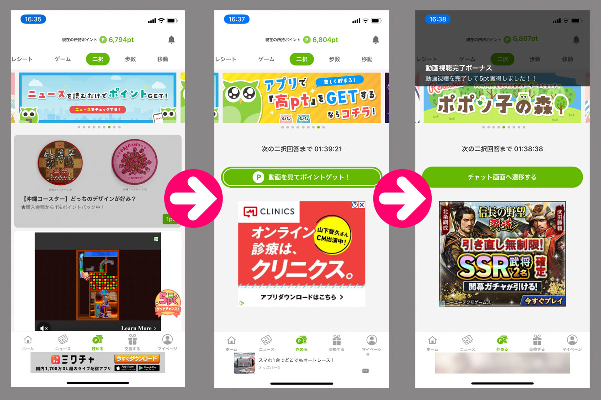 また途中で「5ptゲットチャンス」のアイコン(右下)に出るとそれをタップして動画広告を再生して更に5ポイントが入ります。トータル15ポイントと少ないですがこのイベントは2時間置きぐらいに発生するので歩いたり移動しなくても得ることが出来ます。