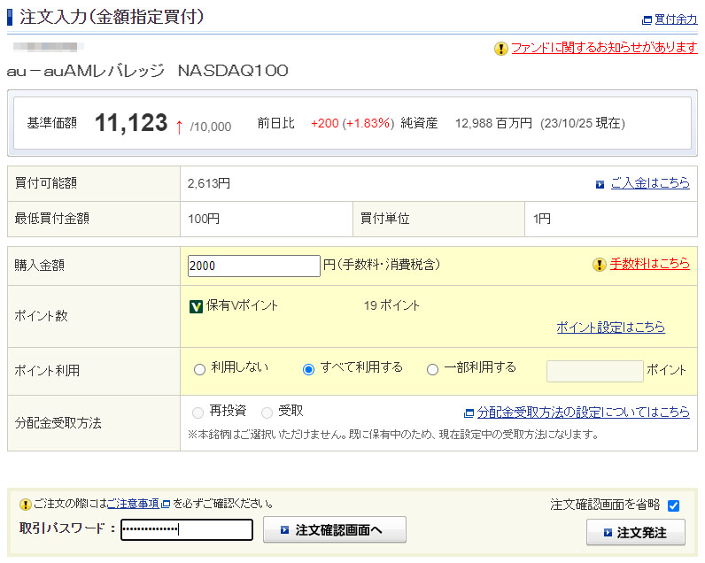 Vポイントが入ったのでauAMレバレッジNASDAQ100を2,000円分追加|2023.10.26 こちらも連日になりますが「auAMレバレッジNASDAQ100」にも2,000円分を! ポイントはやはり半分の19ポイントで、口座からの持ち出しは1,981円です。 やはり明日の扱いで約定は月曜の夕方です。 イスラエルとハマスが戦争をはじめてから特にグロースは上がったり下がったり・・・。しかも今は決算シーズンなので私のような素人には日米とも全く読めません。もっともこれに関しては積立みたいなものなので只管愚直に入金してますがw