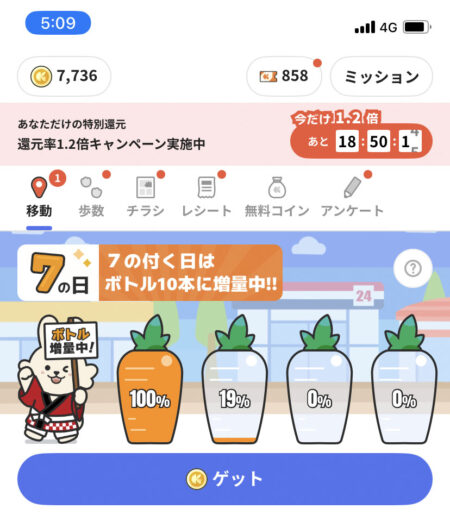 クラシルリワード毎月7の付く日はボトルが10本 今月から(↓)このようになっています。今回で2回目 画面では見えていませんが通常5本のところ10本に増量されます。 さらに、こちらは恒久かは分かりませんが還元率が1.2倍だそうです。 これは嬉しい!5本だと結構頻繁にコイン化しなければなりませんが10本だと余裕が生まれます。 私の場合10本なら通勤電車内の時間に丁度イイ感じ。ですので車内でチマチマ動画を再生する必要がなくなります。